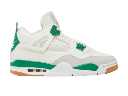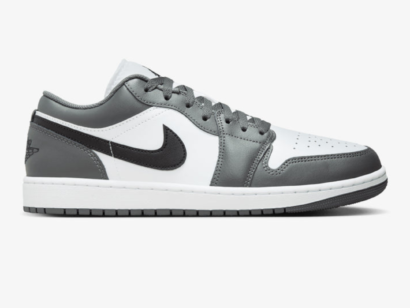 The Air Jordan 4 “Photon Dust” sneakers come in a light-grey hue. They’re crafted from calf leather and are enhanced with a beige Jumpman logo that matches the eyelets.