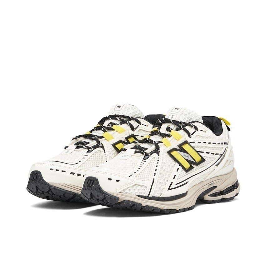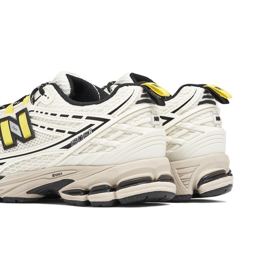 This version of the New Balance 1906R has an upper made of mesh in an Egret white color. The sections of mesh have different weave patterns for visual interest. White overlays with black accents cross the shoe, supporting the toe box and side panels, as well as the heel and ankle. The New Balance N appears on each side in a bright yellow color, and the heel is supported by Egret TPU containing NB branding in black. GANNI branding is seen on the heel pull tab, while the tongue features dual branding. The midsole is a light-brown color, and the outsole is black.