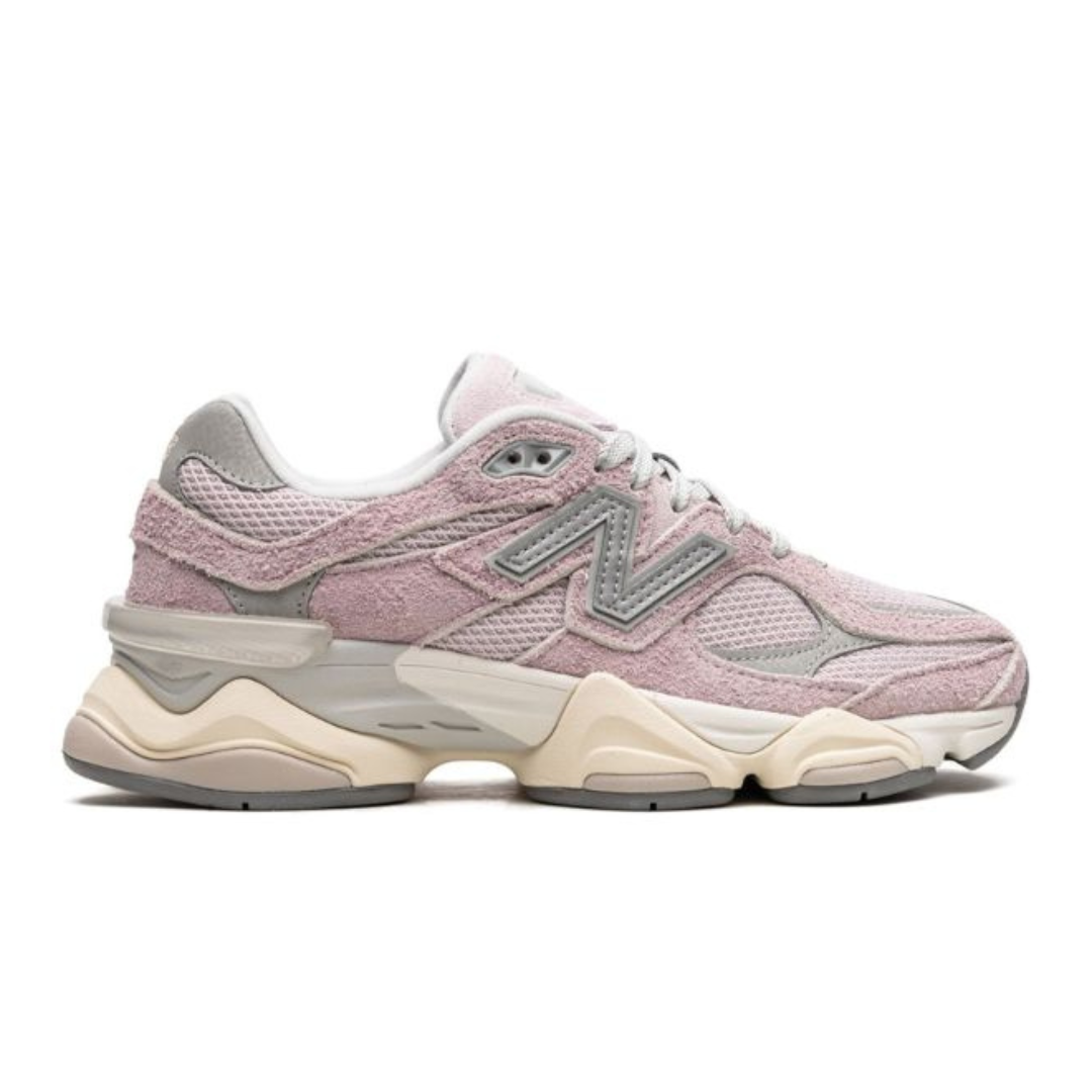 The New Balance 9060 sneaker spotlights the brand’s innovative approach to design. This model retains familiar features from the classic 99X silhouette with its wavy lines and a futuristic feel. This iteration is showcased in pink and grey. It boasts exaggerated proportions with ABZORB and SBS cushioning