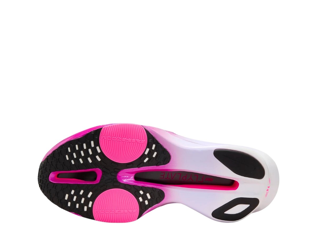 help push the boundaries on your limits, with three technologies to assist power your run, including a full-length carbon plate, full ZoomX foam midsoles from head-to-toe and a double dose of Air Zoom units. A white color base made from mesh-like textile, the shoe has purple, grape, pink, and black coloring elements. A giant Nike swoosh reaches from the midsole onto the upper outside of the shoe while the Nike Zoom X logo sits on the opposite midsole in pink. Extreme traction on rubber outsoles propels you even in the wettest of weather.