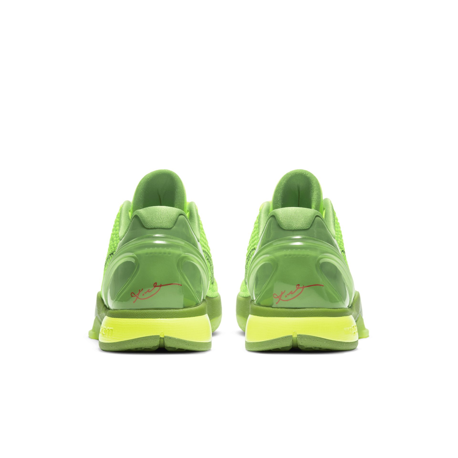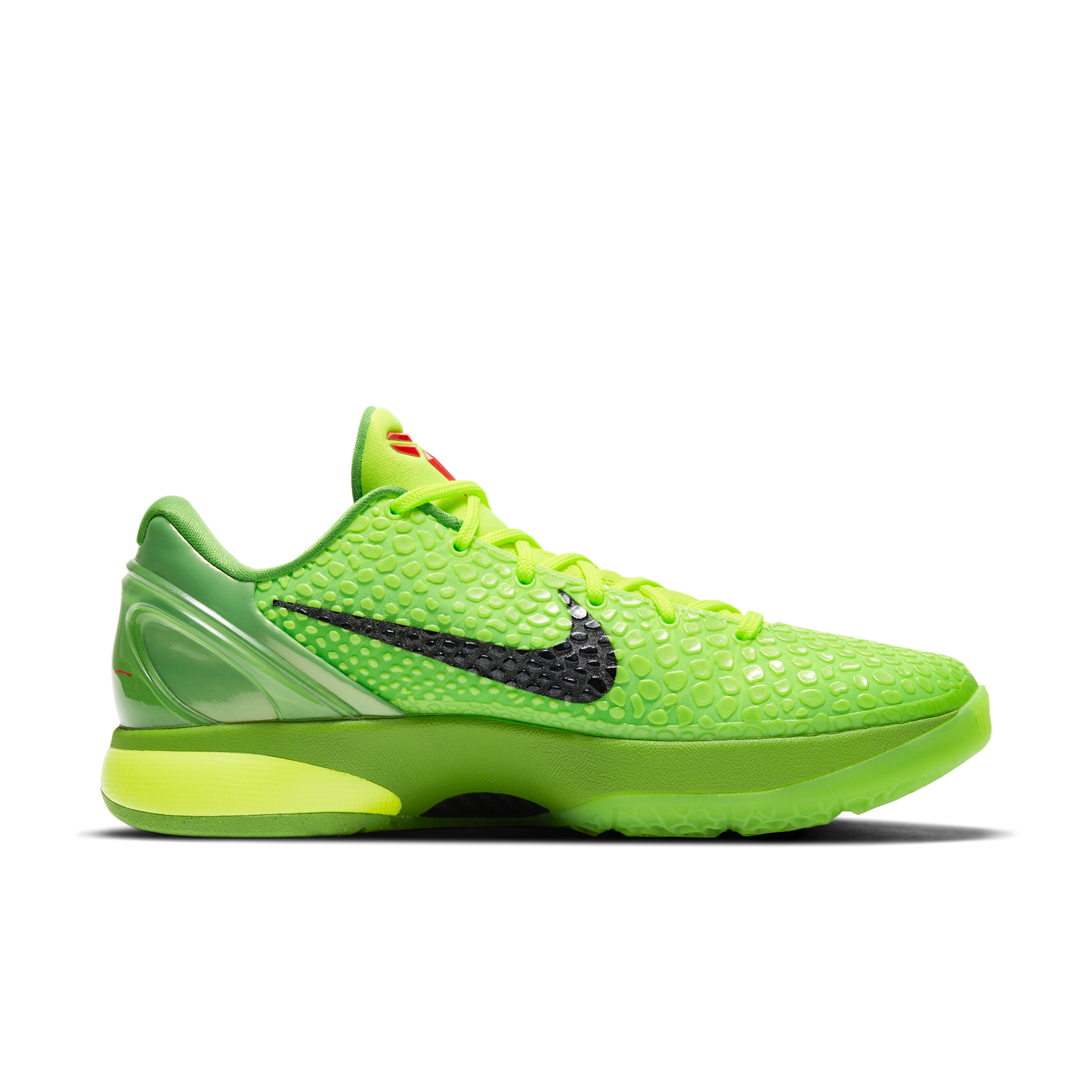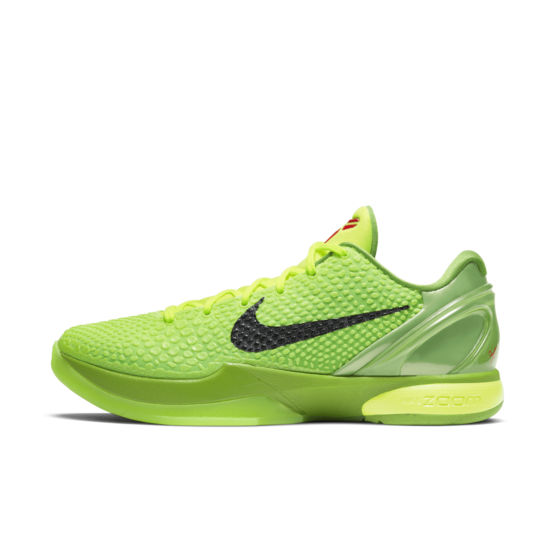 At a first glance, the Nike Kobe 6 Grinch looks identically like the OG pair from 2010: it features a Green Apple and Volt textured, snake-inspired upper as a tribute to Kobe’s Black Mamba moniker. A black Swoosh, red Kobe branding on the tongue, and green translucent outsole accentuate the shoe’s reptile theme. But, because this is a Protro, there are some differences. The updated Kobe 6 Grinch arrives with a more responsive Zoom Air cushioning system and scaled-down traction for an improved court feel. The silhouette shape is even altered to provide a lower, sleeker fit.