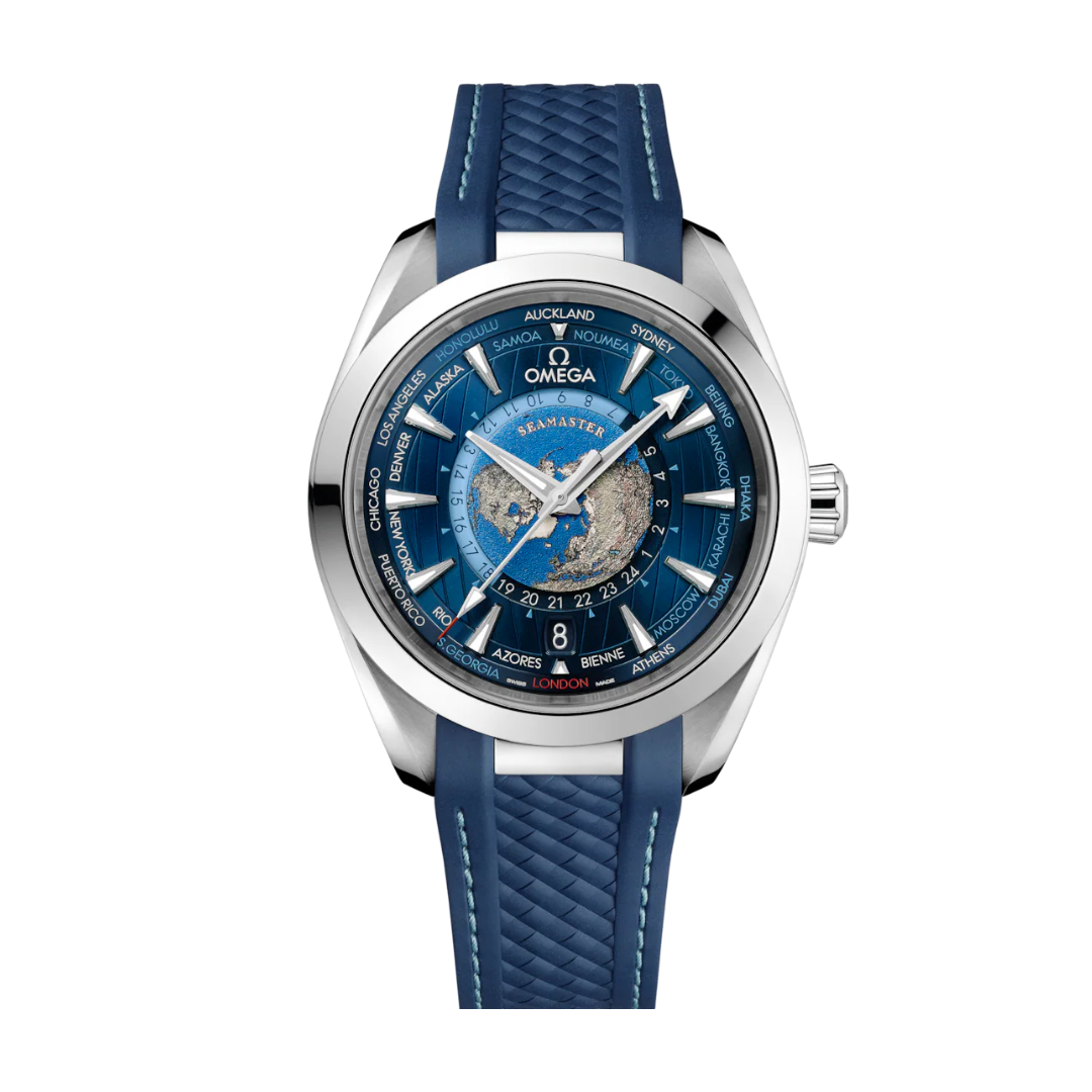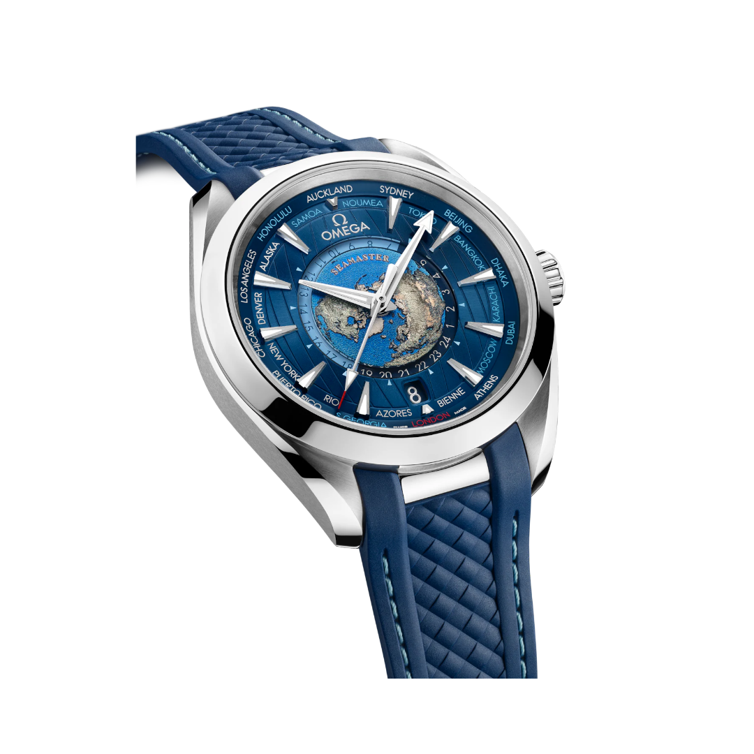 This 43 mm Worldtimer model includes a polished case in stainless steel which is integrated with the structured blue rubber strap via a solid polished link.